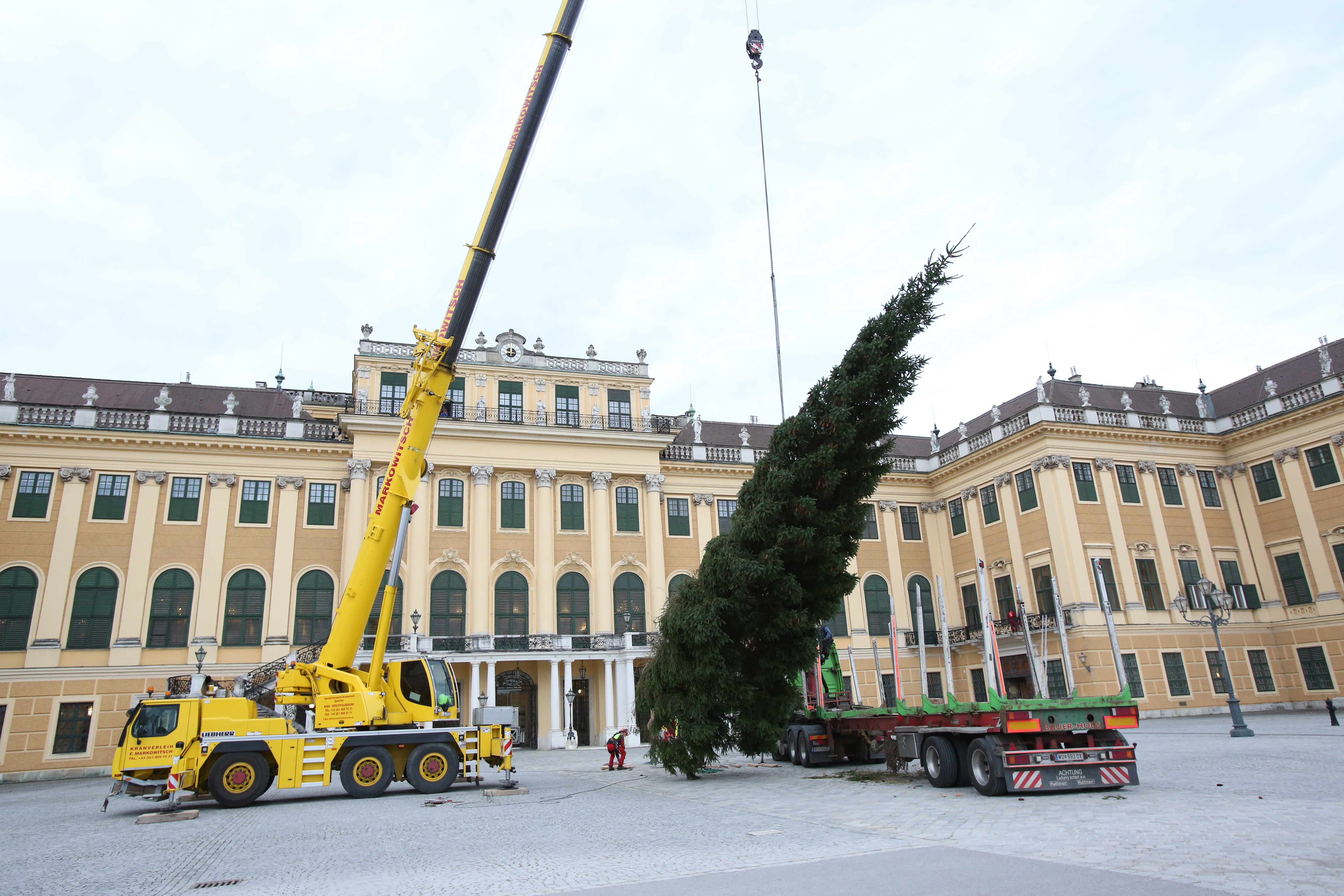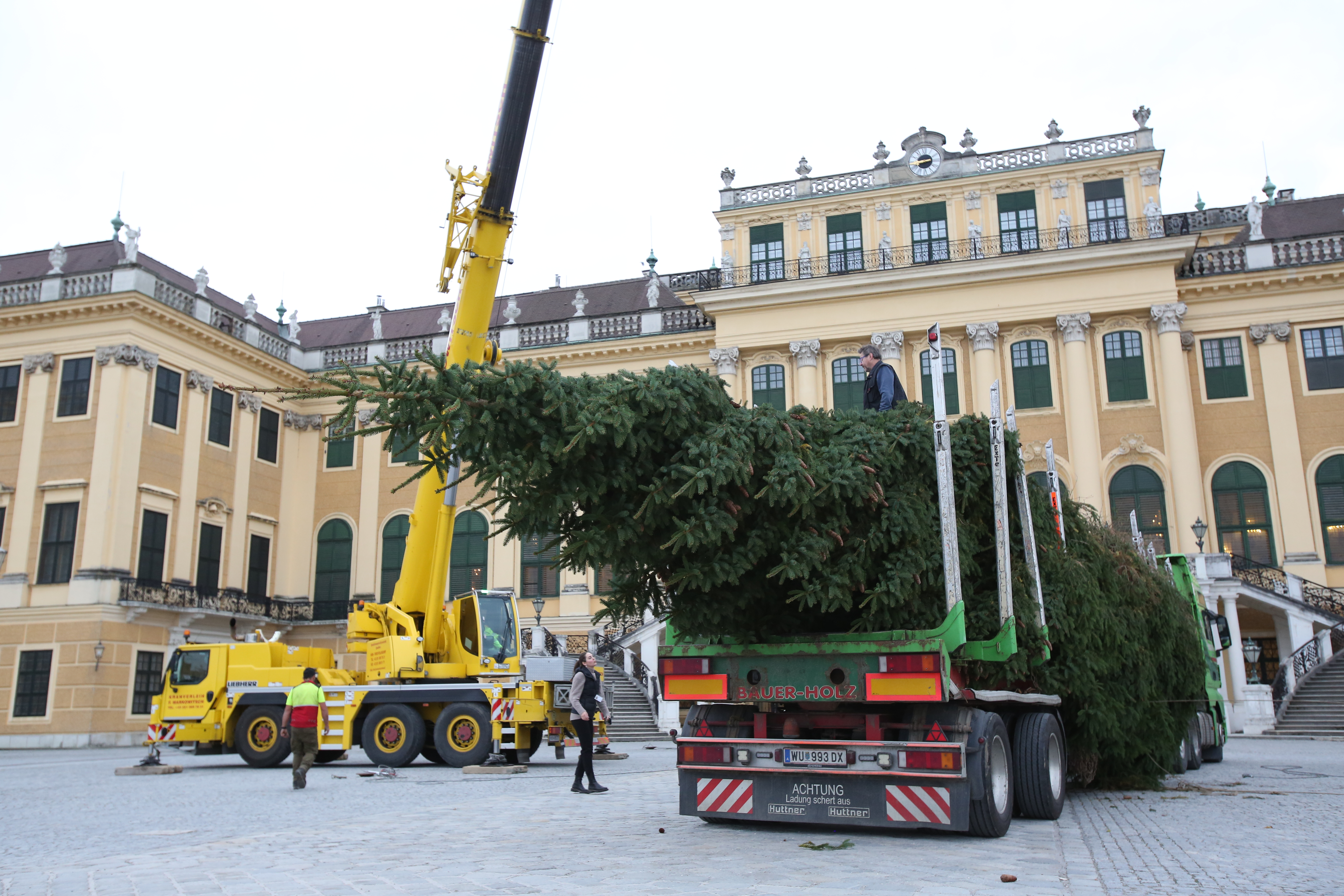 18 Meter hohe Fichte aus dem Forstrevier Gosau der Österreichischen Bundesforste (ÖBf) wurde vor dem Schloss Schönbrunn aufgestellt